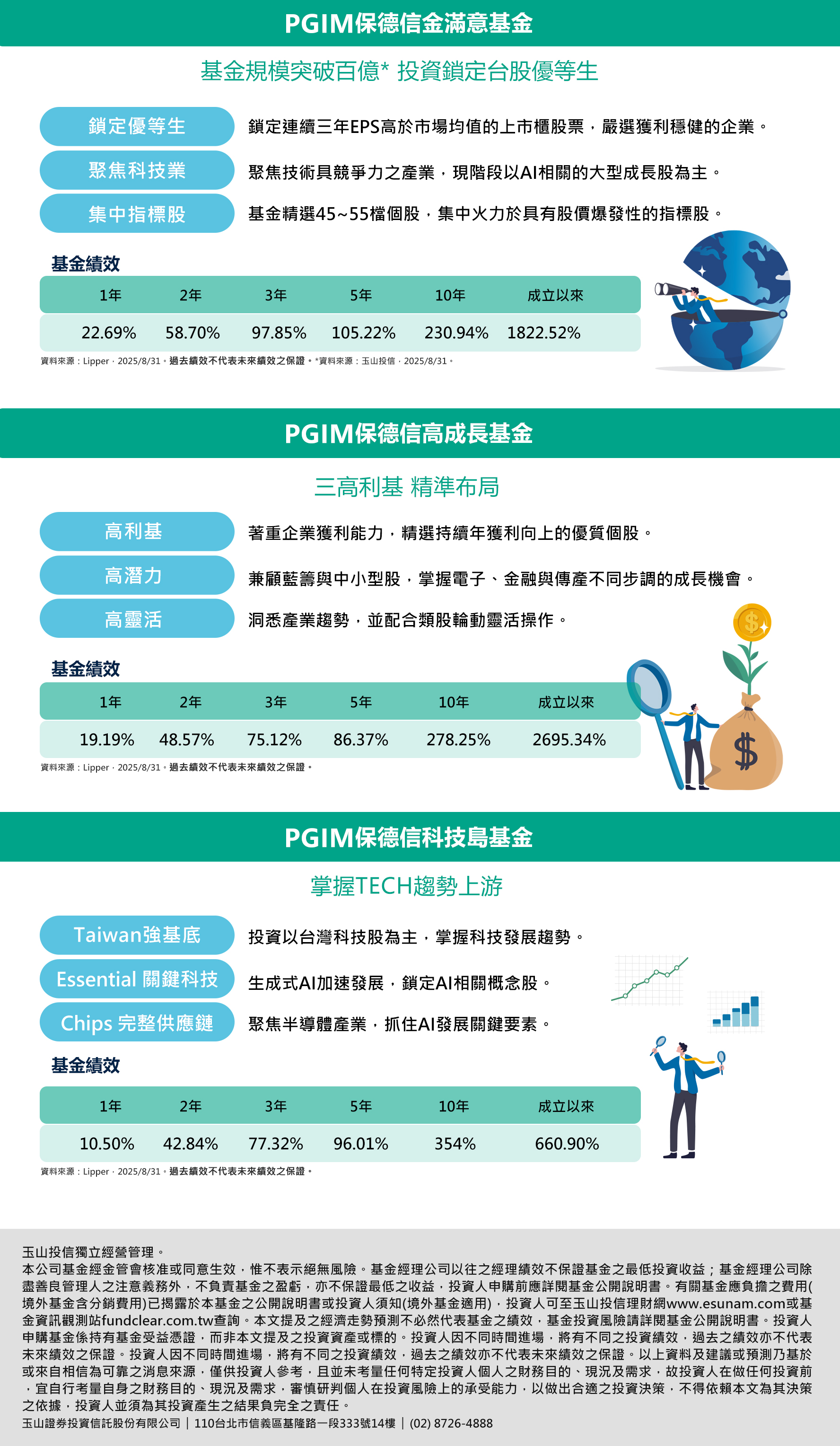玉山投信深耕台股市場逾30年,擁有專業研究投資團隊,具深厚市場洞察實力,旗下台股基金歷經多次產業升級與輪動,持續引領投資人掌握趨勢脈動,抓住每波投資契機,達成長期投資目標,成為值得信賴的投資好夥伴!