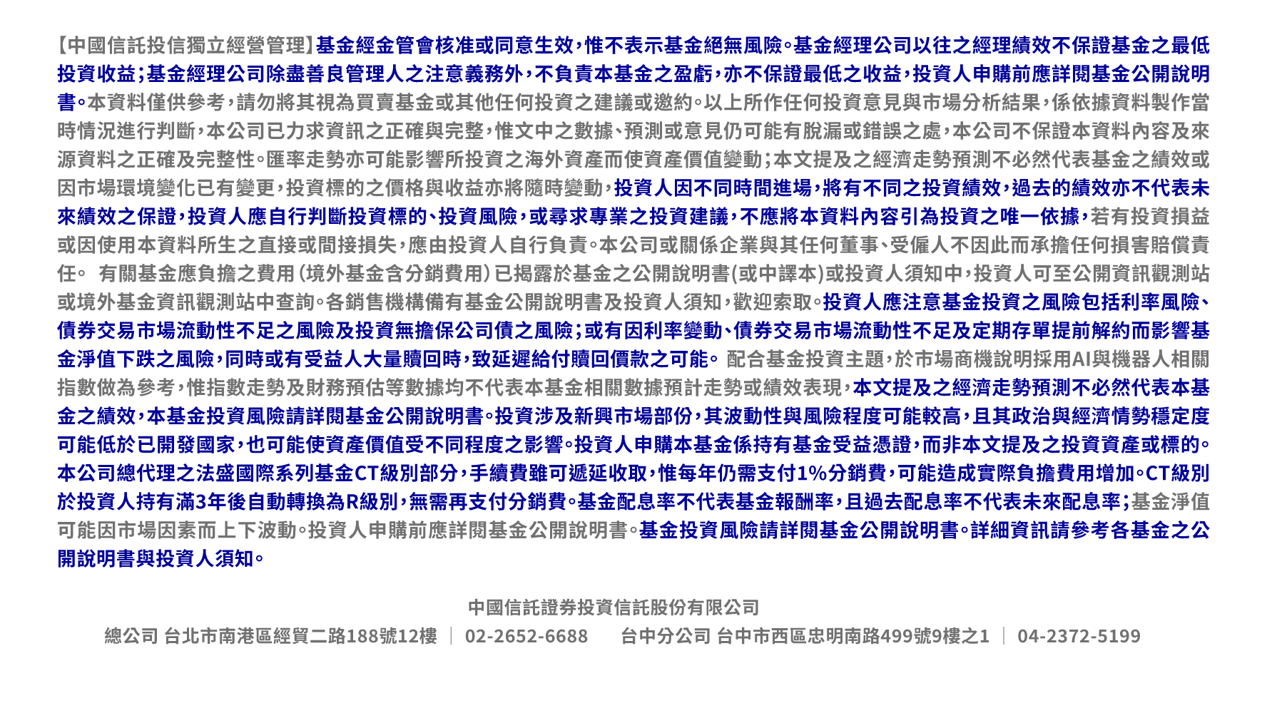 - 本行提及之經濟走勢預測、排行榜功能不必然代表相關基金之績效,本行不擔保信託業務之管理或運用績效,投資人及受益人應自負盈虧,投資基金所涉之風險不限於以上所述之風險,投資前請詳閱各基金之公開說明書或投資人須知,並暸解各項投資風險(包括最大可能損失為損失所有投資本金)。