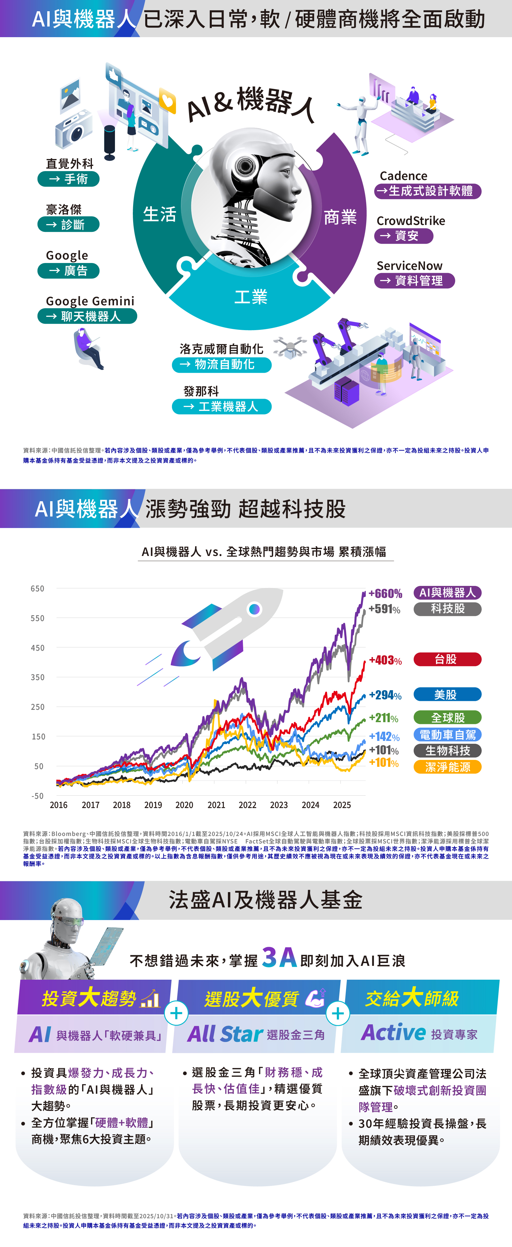 ▶自動化主打星》(點選基金名稱看更詳細介紹)法盛AI及機器人基金:掌握AI與機器人雙趨勢,軟/硬體一次囊括,迎上無人科技趨勢爆發動能!