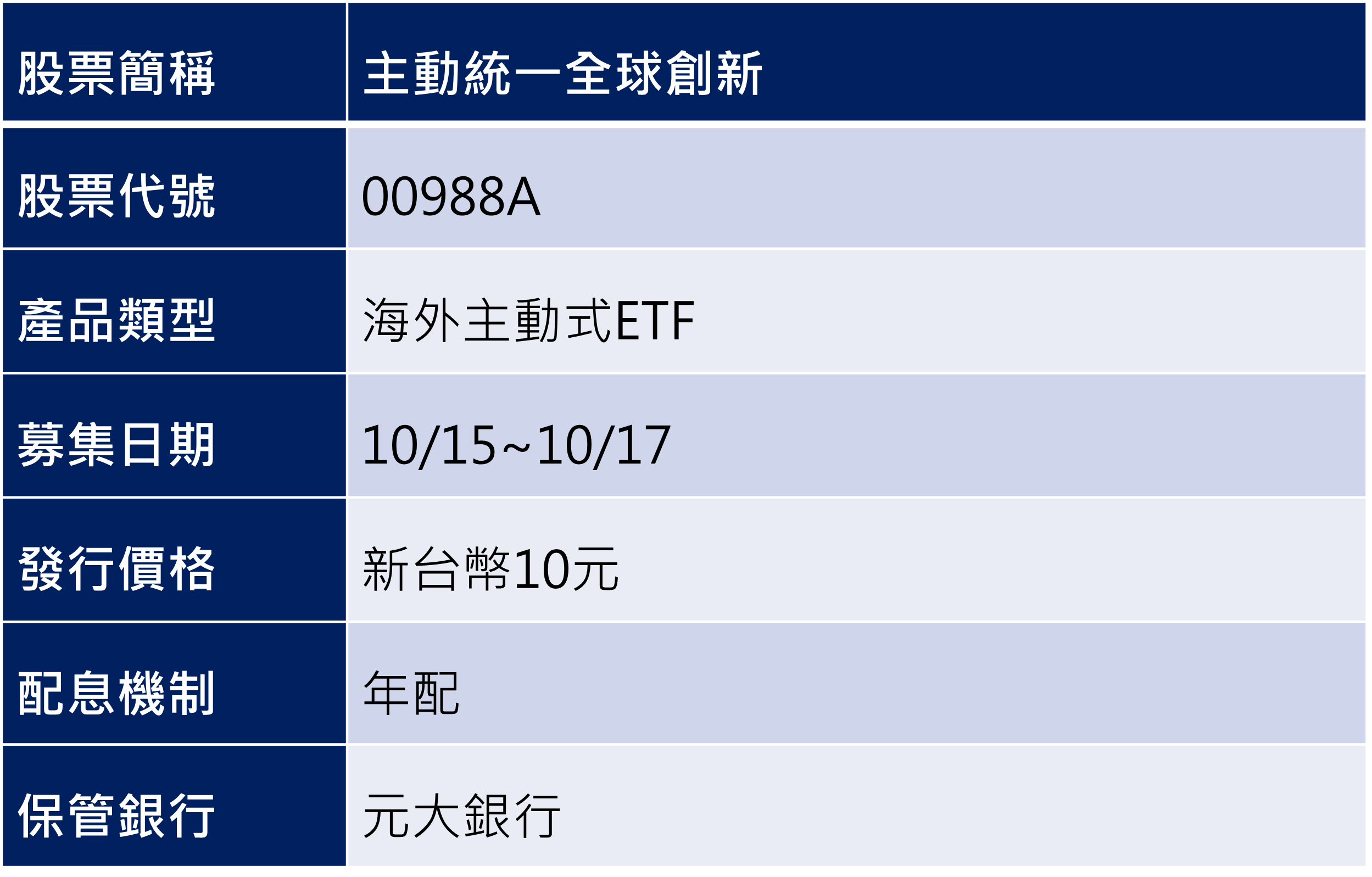 繼台股主動式ETF 00981A之後,主動式投資專家統一投信再推出「統一全球創新主動式ETF」(基金之配息來源可能為收益平準金)(00988A),聚焦全球創新浪潮,採用金三角策略、「霸主與新星」雙引擎配置,鎖定六大創新主軸,將於 10/15~10/17募集繳款,發行價每股新台幣10元,提供投資人具成長性與前瞻性的全球創新投資選擇。