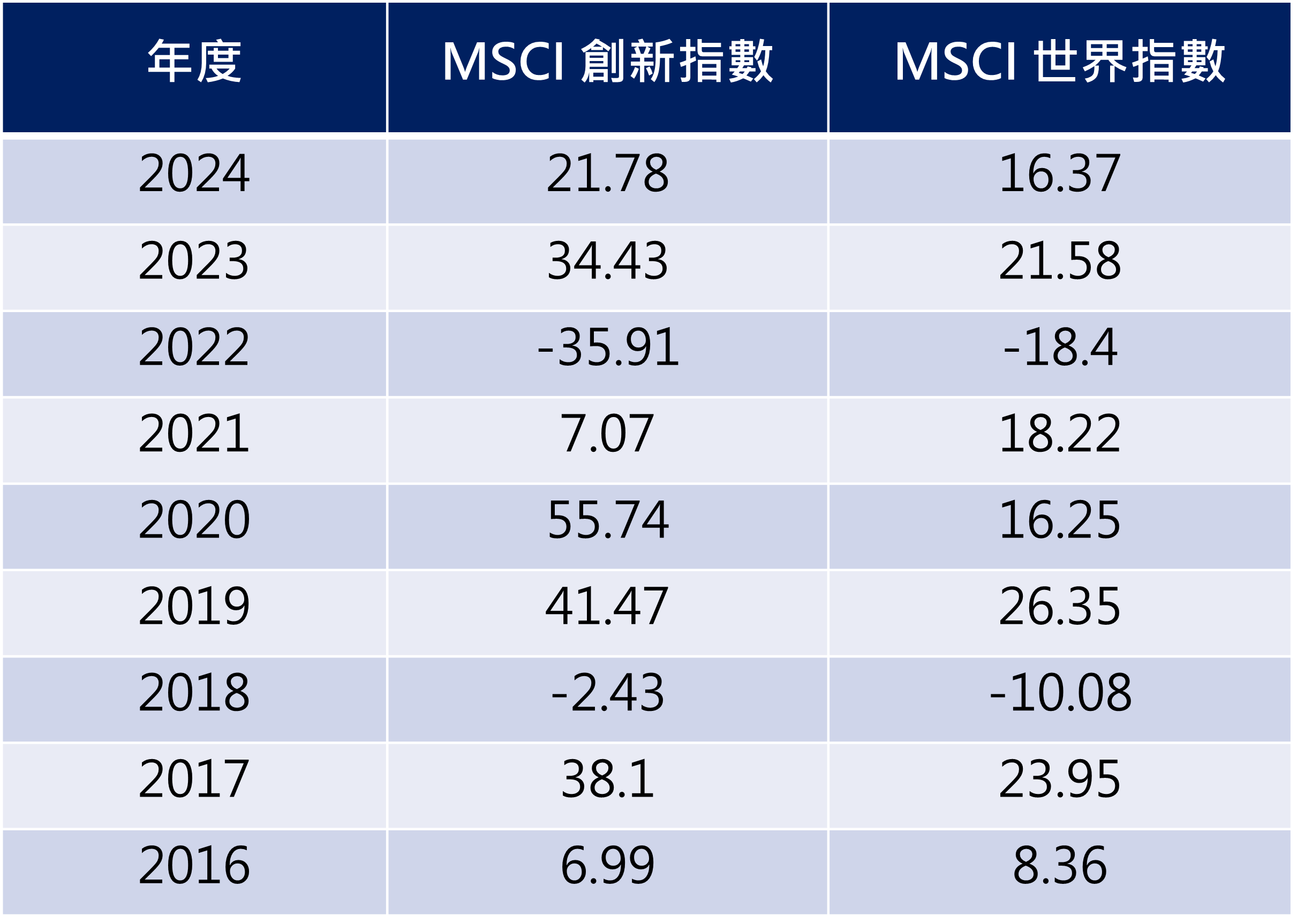 MSCI 創新指數、MSCI世界指數近年來單年報酬率