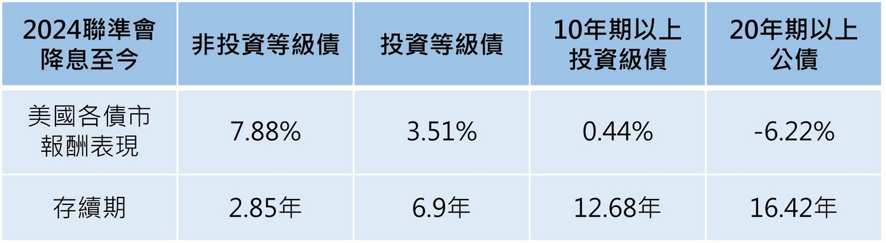 富蘭克林證券投顧點出,市場對降息的樂觀預期帶動美國十年期公債殖利率在九月降息公布前一度跌破4%,決議公布後殖利率反倒是彈升,其實隱含市場對「風險管理式降息」的疑慮,儘管就業市場鬆動為降息增添利多,但美國通膨數據仍在3%左右,距離聯準會目標仍高出約1個百分點,加上關稅影響尚未完全顯現,投資人應審慎看待降息前景,債市佈局宜優先靠攏存續期較短的非投資等級債。統計自2024/9聯準會降息至今,美國各類債市以存續期不到3年的非投資等級債漲幅7.88%領先,優於存續期近7年的投資級債與10年期以上投資級債的3.51%與0.44%表現,至於更長期的20年期以上公債則仍處於-6.22%的負報酬表現。(表二)