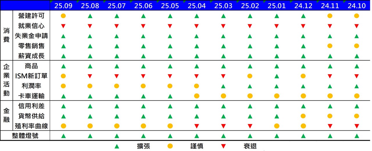 富蘭克林坦伯頓基金集團美國經濟儀表板追蹤三大類共十二項經濟指標,九月數據顯示,失業金申請、零售銷售、薪資成長、商品、卡車運輸、信用利差、貨幣供給維持在「擴張」的綠燈,利潤率、殖利率曲線維持在「謹慎」的黃燈,就業信心維持在「衰退」的紅燈,營建許可從綠燈惡化為黃燈,但ISM新訂單從紅燈改善為黃燈,整體燈號連16個月亮綠燈。