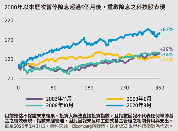 歷史經驗顯示,降息循環往往是催動科技股漲升的關鍵轉折點。根據聯博統計,自2000年以來,聯準會暫停升息後重啟降息的周期,MSCI世界科技指數平均漲幅介於27%至87%之間。