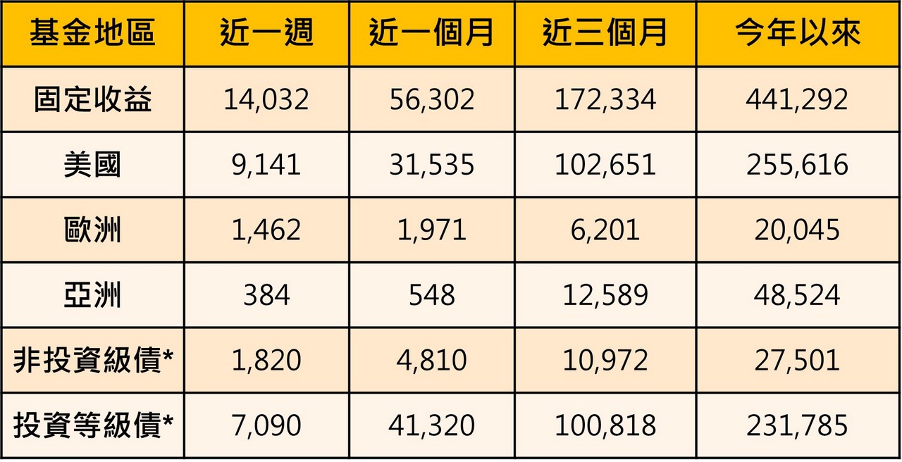 美國政府繼續關門,而受油價勁揚,且川習會時間確定市場風險偏好再起,美國十年期公債殖利率回升至4%之上。過去一週淨流入整體固定收益型ETF資金140.32億美元,其中美國債市獲淨流入91.41億美元,歐洲與亞洲債市分別獲14.62億與3.84億美元淨流入。由債券品質分類,投資等級債市淨流入70.9億美元,非投資等級債市淨流入18.2億美元。(附表四)