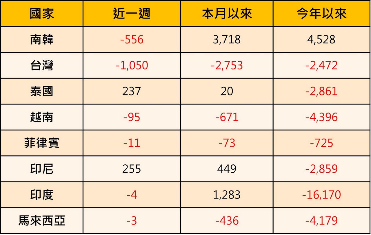 川習會確認加以中國經濟數據多優於預期,過去一週亞洲股市呈現上漲走勢,然而,就外資動向而言操作反而較為保守,僅印尼與泰國股市獲外資淨買超,台灣、南韓、越南、菲律賓、印度與馬來西亞股市均遭外資淨賣超,尤其台股遭10.5億美元淨賣超最為嚴重。