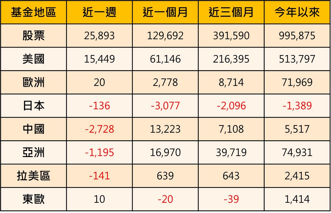資料來源:彭博資訊,資料時間2025/10/27 8am,統計彭博資訊可查詢之所有ETF資金流量。*採資產類別分類,其他採地區分類。