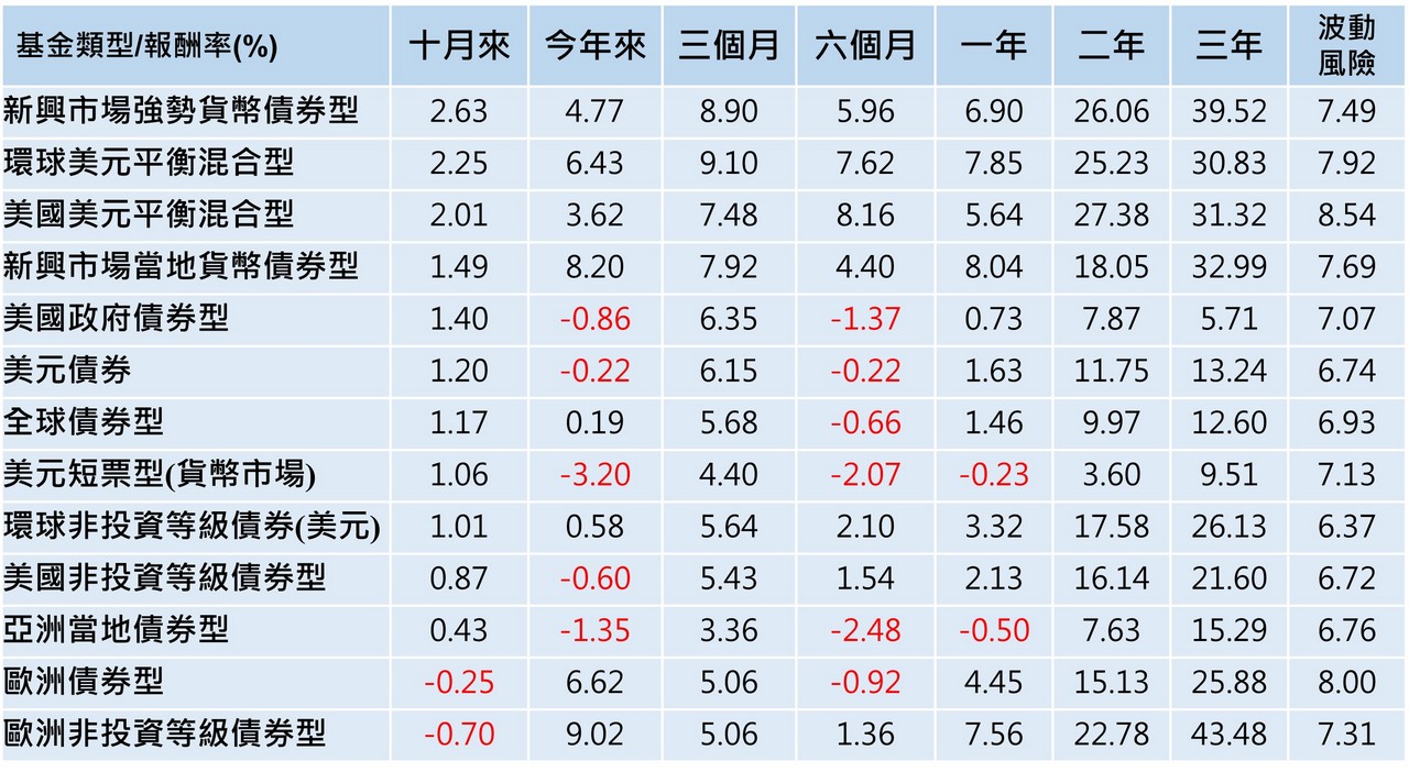 十月股票表現持續優於債券,環球和美國平衡型基金台幣平均報酬率2.25%與2.01%,優於多數的債券型基金。純就債券投組,因美國政府關門、聯準會降息的期待,以及避險情緒一度牽動十年期公債殖利率跌破4%關卡,激勵資金流往高殖利率的新興債市,新興市場的強勢貨幣債券型和當地幣債券型基金平均上漲2.63%和1.49%領先。(理柏資訊,截至10/30)