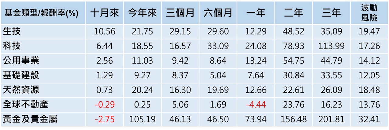 十月主要產業型基金中,以生技股票型基金台幣平均上漲10.56%領先,反應多家新藥臨床試驗有積極進展,以及企業併購利多而推升股價大漲,漲幅高於科技股票型基金的6.44%。另一方面,先前漲勢強勁的黃金貴金屬股票型基金因市場避險需求減弱,以及金價頻創新高後的獲利了結賣壓,而於十月拉回2.75%,然而今年以來仍有105%漲幅居冠。(理柏資訊,截至10/30)