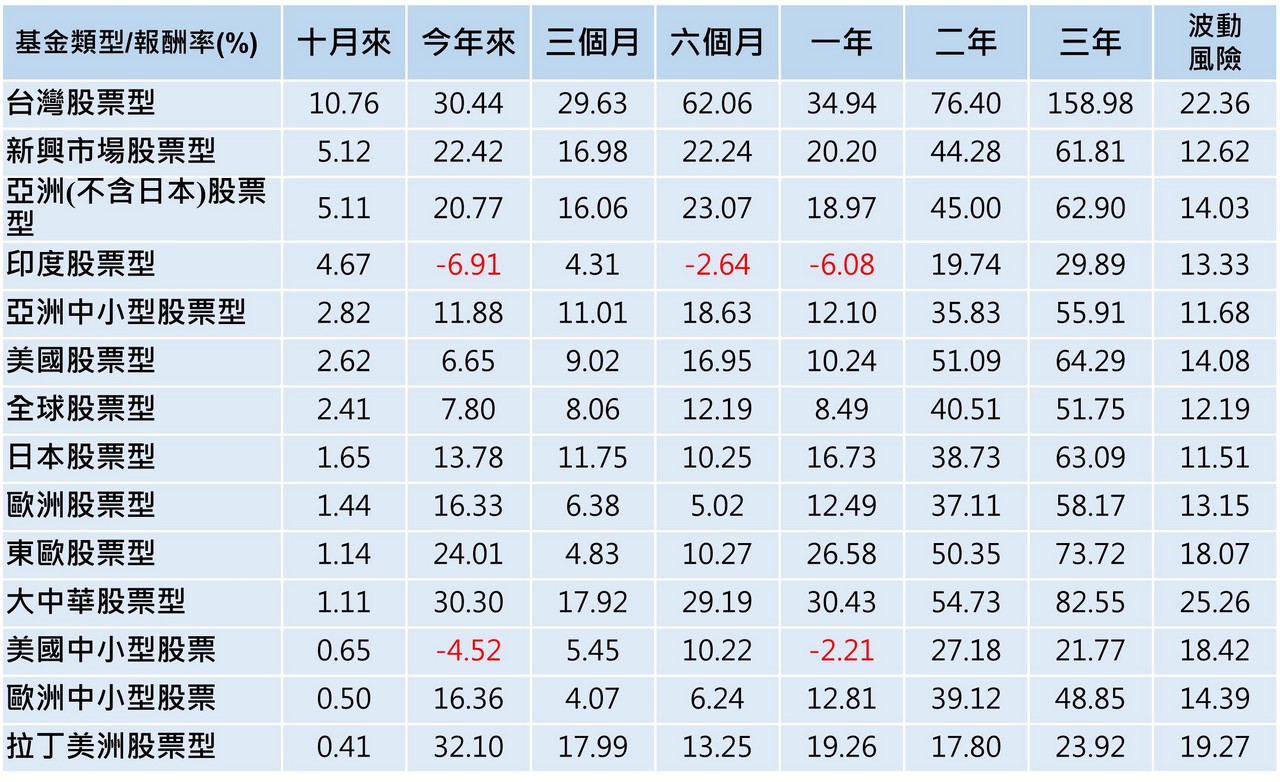 就海外基金績效,總計十月以來台灣金管會證期局核備的963檔境外基金(包括股、債、平衡型、票券、另類投資)平均上漲2.06%,其中,625檔股票型基金平均上漲2.51%,56檔混合資產(平衡型)基金平均上漲2.23%;260檔債券型基金平均上漲1.07%。(理柏資訊,換算台幣報酬截至10/30,台幣相對美元貶值0.72%)
