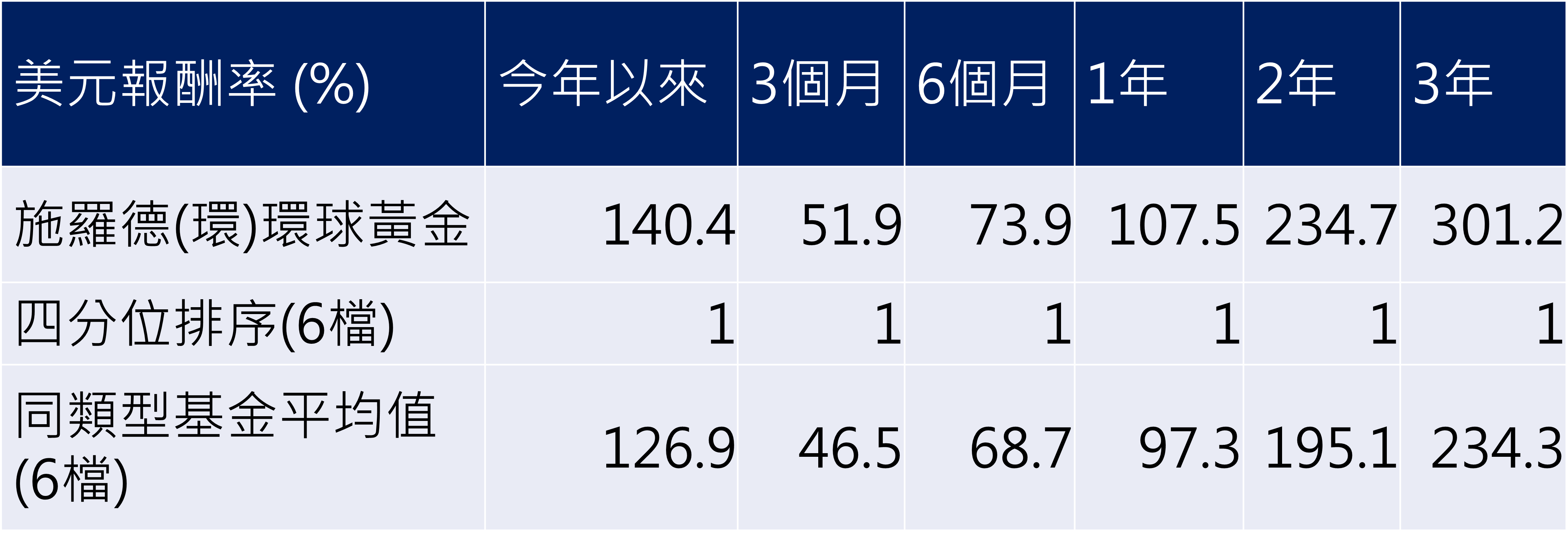 金礦股亮麗的表現,推升投資金礦股的黃金基金強勁的走勢。今年以來截至10月29日,黃金價格上漲50.9%,同期間追蹤全球主要黃金採礦公司股價表現的富時金礦指數上漲127.3%,也讓黃金基金成為全方位掌握黃金產業價值最佳的投資工具。