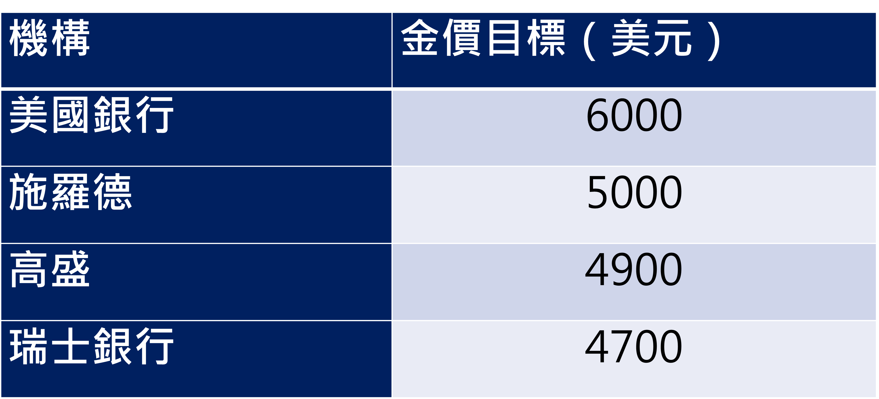 儘管短線震盪,市場對黃金的長線行情仍抱持高度信心。各大投銀紛紛上調金價目標: