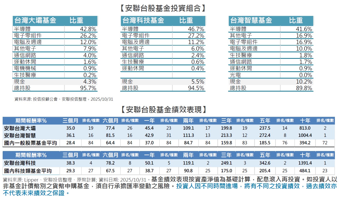 安聯台股基金維持高持股,配置仍以科技類股為主軸。科技看好AI/雲端伺服器、IP(矽智財)/ASIC(客製化晶片)、先進/特殊製程、先進封測、高階PCB、銅箔、玻布、記憶體相關族群,傳產留意USMCA(美墨加協定)/美國製造、生技新藥等公司。台股團隊將持續觀察產業脈動適時調整。