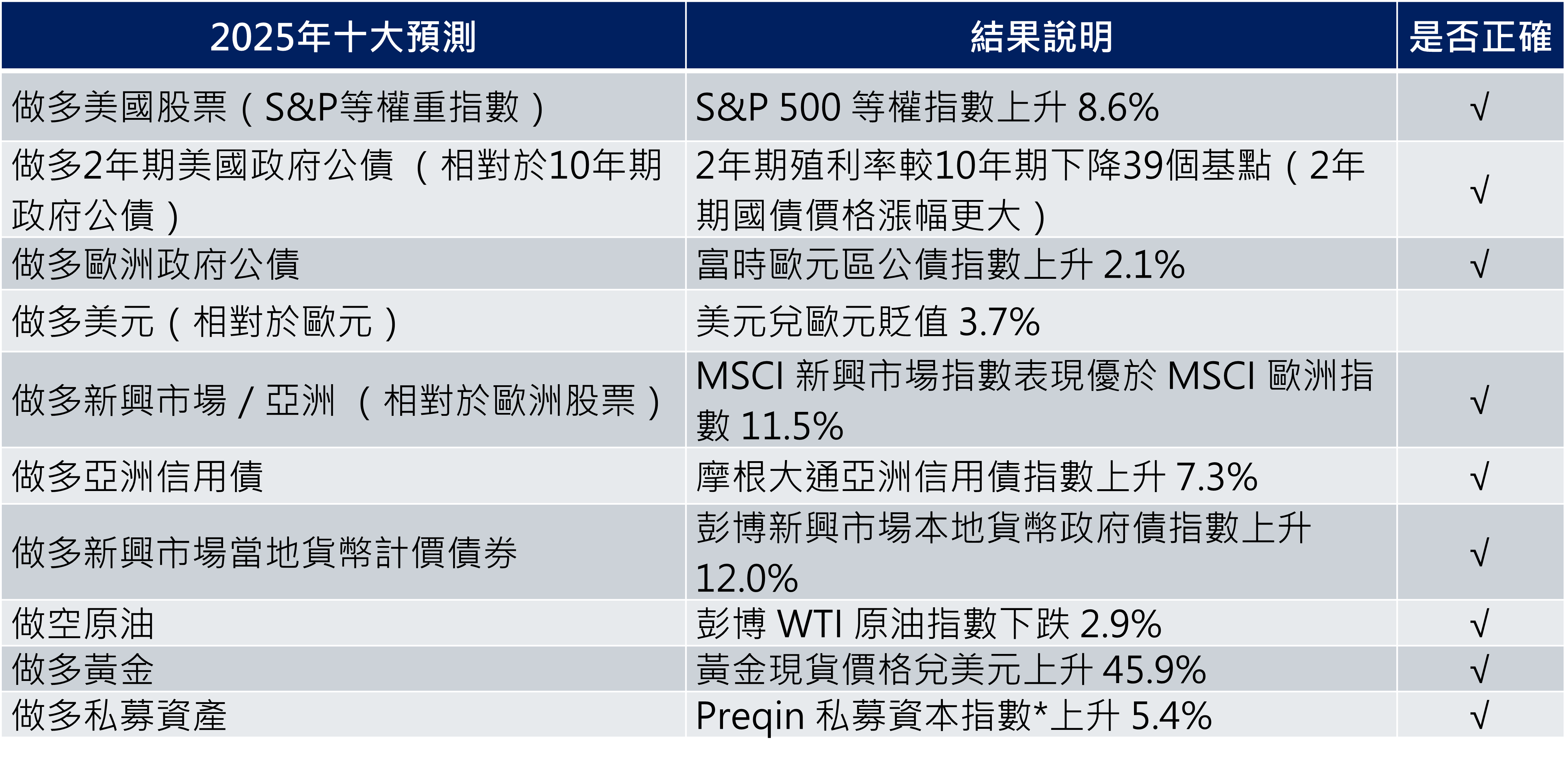 去年施羅德十大市場預測中,九項表現符合預期,包括美國股票、新興市場本地貨幣債、黃金與私募資產,展現施羅德深厚的市場洞察力與研究實力。