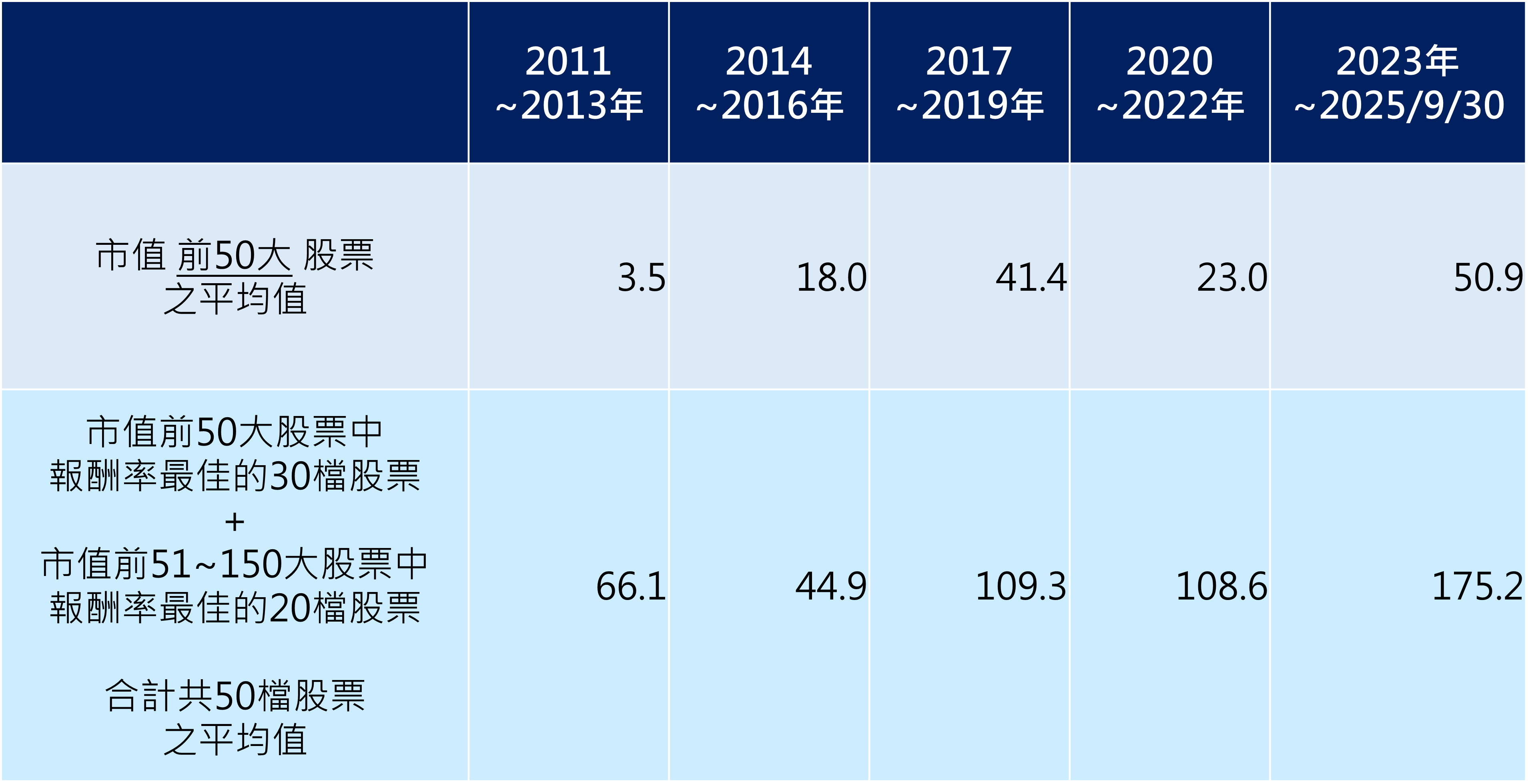 根據統計,從2011年至今,若投資組合不只限於市值前50大,而是加入市值51到150大中報酬表現最佳的股票,累積報酬率大幅超越單純的台灣50。舉例來說,2017至2019年間,台灣50平均報酬率僅約41%,但若以「最佳50檔」組合計算,報酬率卻高達109%,由此可見,即使是『第二梯隊』,往往也不乏黑馬隱身其中。(表二)