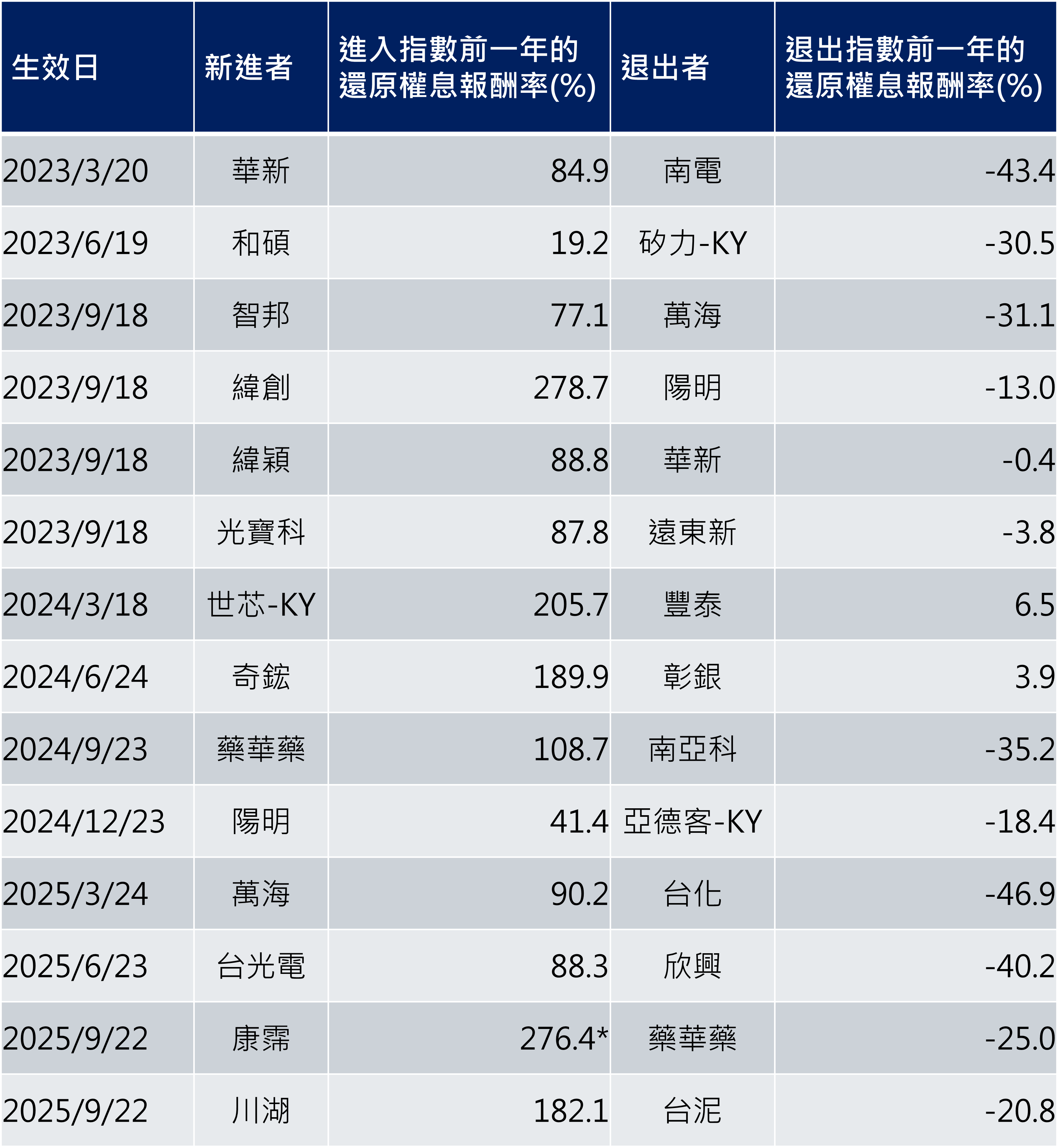 以上資料為舉例說明,不代表未來實際績效。個股與相關數據資料僅供說明之用,不代表投資決策之建議。以富時臺灣證券交易所臺灣50指數(本文稱之為台灣50指數)之成分股調整及其生效日為例。資料來源: CMoney、臺灣指數公司、復華投信整理。*康霈於2024/10/4由興櫃轉上市,上表所列報酬率自該日起算至指數成分調整生效日。