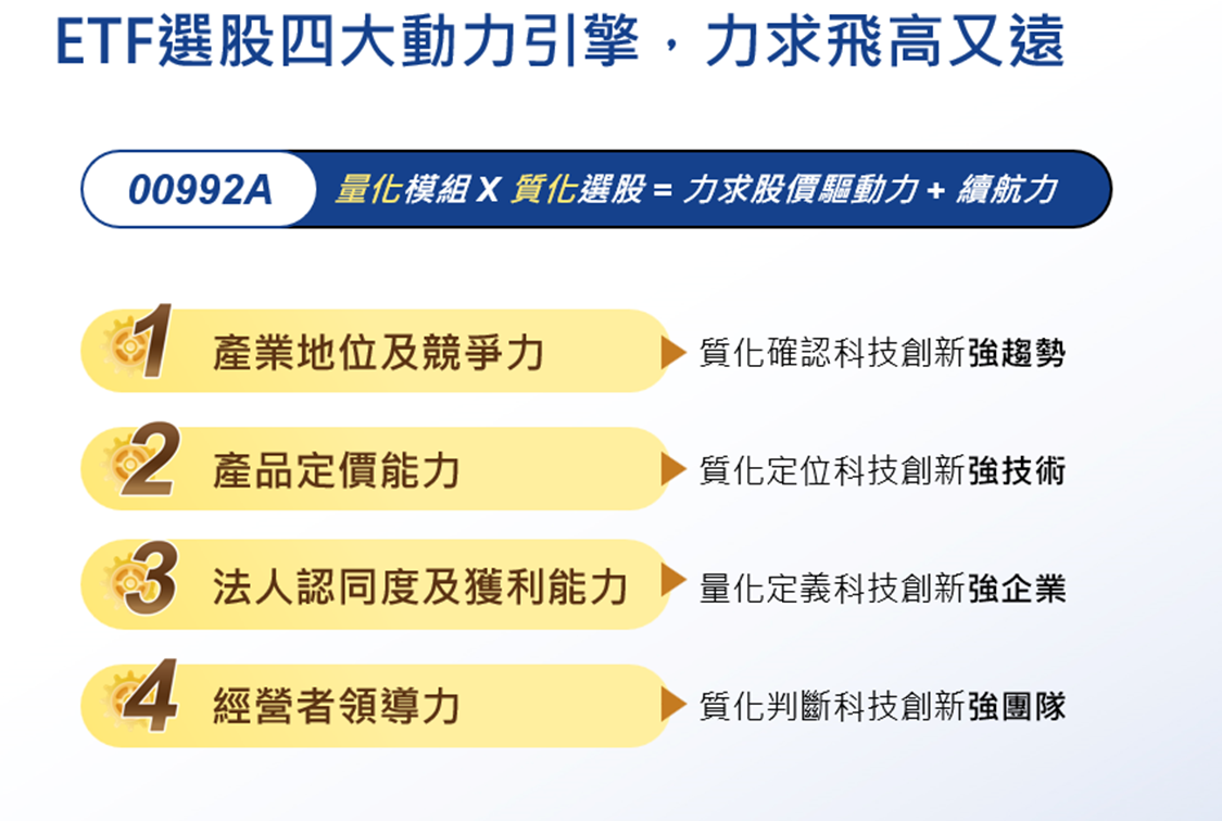 群益00992A四大質量化並重選股策略,篩選台股科技創新強趨勢股