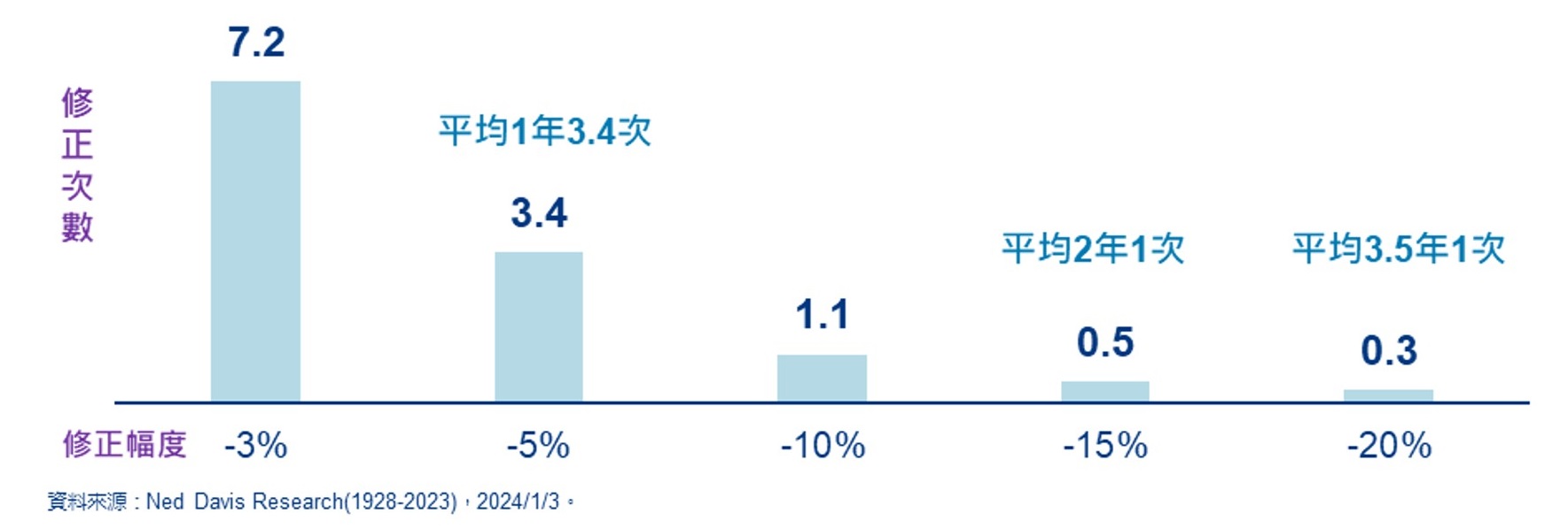 S&P 500 平均每年波段-3%、-5%、-10%、-15%及-20%修正的次數
