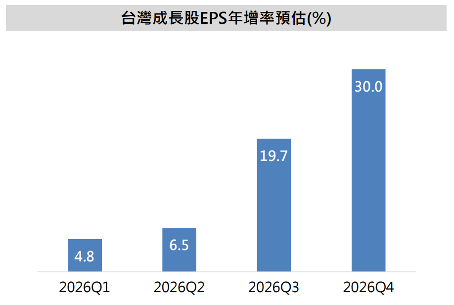 觀察近15年,台灣成長股自第四季起進入旺季,12月進場持有1至3年平均報酬率可達19%、41%、61%,深具長期投資吸引力!特別是2026年台灣成長股EPS年增率預估將由第一季的4.8%跳升至第四季的30%,評價提升潛力可期。此時進場,不僅能卡位未來成長主流,更能搭上2026年企業獲利走升的推力。