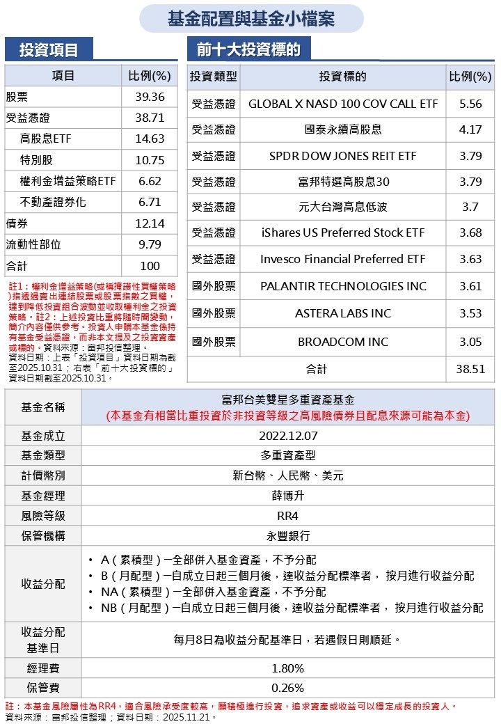 【富邦台美雙星多重資產基金(本基金有相當比重投資於非投資等級之高風險債券且配息來源可能為本金)】本基金經金管會同意生效,惟不表示本基金絕無風險。基金經理公司以往之經理績效不保證本基金之最低投資收益;基金經理公司除盡善良管理人之注意義務外,不負責本基金之盈虧,亦不保證最低之收益;本文提及之經濟走勢預測不必然代表基金之績效;基金之投資風險及有關基金應負擔之費用已揭露於基金之公開說明書,投資人申購前應詳閱基金公開說明書。本公司及各銷售機構備有簡式公開說明書或公開說明書,歡迎索取;投資人亦可連結至富邦投信網頁(https://www.fubon.com/asset-management/index)或公開資訊觀測站(https://mops.twse.com.tw)查詢。有關本基金運用限制、應負擔之費用及投資風險之揭露請詳見本基金公開說明書。