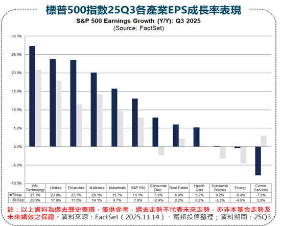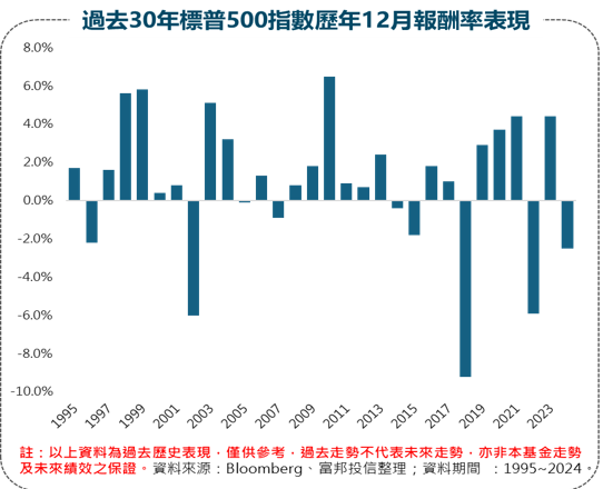 11/20台灣時間凌晨,輝達公佈財報亮眼且優於市場預期,今年截至11/14為止,標普500指數25Q3 EPS成長13.1%,其中科技股EPS強勁成長27.3%,成為美股漲勢主要驅動關鍵。今年11月美股一反常態表現震盪,反映高估值與政府關門等議題干擾影響。展望12月美股表現,統計過去30年標普500指數12月表現,儘管年末長假影響股債交投較清淡,但受惠年終銷售旺季加持之下,標普大盤勝率仍有七成,平均漲幅亦有2.7%。隨著時序進入至12月,關注12/10 Fed利率決策會議、年底前Fed將公佈新主席人選、以及美國政府重啟運作下,非農就業報告與通膨數據表現,關係Fed利率走向與資金流向變化。