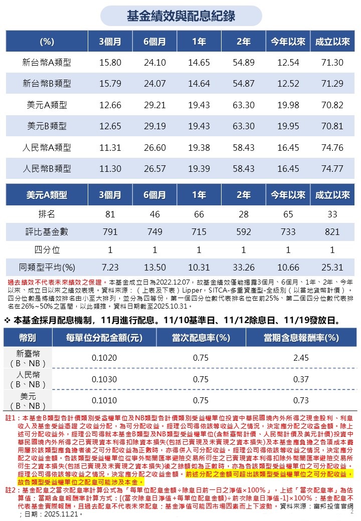 - 投資人因不同時間進場,將有不同之投資績效,過去之績效亦不代表未來績效之保證。基金配息不代表基金實際報酬,且過去配息不代表未來配息;基金淨值可能因市場因素而上下波動,投資人於獲配息時,宜一併注意基金淨值之變動。