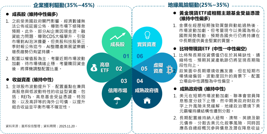 【富邦雙核心戰略多重資產基金(本基金有相當比重投資於非投資等級之高風險債券且配息來源可能為本金及收益平準金)】【富邦投信獨立經營管理】本基金經金管會或其指定機構核准或同意生效,惟不表示本基金絕無風險。基金經理公司以往之經理績效不保證本基金之最低投資收益;基金經理公司除盡善良管理人之注意義務外,不負責本基金之盈虧,亦不保證最低之收益;本文提及之經濟走勢預測不必然代表基金之績效;基金之投資風險及有關基金應負擔之費用已揭露於基金之公開說明書,投資人申購前應詳閱基金公開說明書。本公司及各銷售機構備有簡式公開說明書或公開說明書,歡迎索取;投資人亦可連結至富邦投信網頁(https://www.fubon.com/asset-management/index)或公開資訊觀測站(https://mops.twse.com.tw)查詢。有關本基金運用限制、應負擔之費用及投資風險之揭露請詳見本基金公開說明書。投資人申購本基金係持有基金受益憑證,而非本文提及之投資資產或標的。本基金適合風險承受度中高,願積極進行投資,追求資產或收益可以穩定成長的投資人,由於本基金得視市場情況投資非投資等級債券,投資人投資本基金時不宜占其投資組合過高之比重。由於非投資等級債券之信用評等未達投資等級或未經信用評等,且對利率變動的敏感度甚高,本基金可能因利率上升、市場流動性下降或債券發行機構違約不支付利息、本金或破產而蒙受虧損,故本基金不適合無法承受相關風險之投資人,又本基金可投資於美國Rule144A債券,該債券屬私募性質,故而發行人之財務狀況較不透明,較可能發生流動性不足,財務訊息揭露不完整或因價格不透明導致波動性較大之風險。本基金投資於「具總損失吸收能力(TotalLoss-AbsorbingCapacity;TLAC)債券及「應急可轉換債券(ContingentConvertibleBond,CoCoBond)」之風險:TLAC債券發行之目標是確保全球系統性重要性銀行(G-SIBs)具有必要的吸收損失和資本重組能力,多以主順位型態發行,若持有期間金融機構並非處於破產程序,該類債券之投資風險同一般債券。TLAC債券除有一般債券之共同風險,其他投資風險有:債權減記、利息取消風險、債權轉換股權風險、修改債券條件如到期日、票息、付息日或暫停配息等風險、流動性風險、金融領域集中度風險、突發事件風險等。應急可轉換債券發行主體為各國銀行,為具備特殊條款的可轉換公司債,當特殊條款被觸發時,債券將被強制性轉換成普通股或是減計債券本金,而持有人轉為銀行股東並分攤銀行虧損。因此應急可轉換債券除有一般債券之共同風險,其他投資風險有:發行機構集中度風險、觸發事件轉換風險、流動性風險、債權減記、息票取消風險、受償順位風險等。本基金可投資虛擬資產指數股票型基金,虛擬資產為具有高度投機性的數位「虛擬商品」其交易價格無漲跌幅之限制,容易暴漲暴跌,故有較高的價格波動風險,且目前可能沒有一致的標準及慣例對相關虛擬資產進行估值並確認虛擬資產估值的合理性。本基金計價幣別包含新臺幣、人民幣與美元計價幣別,如投資人以其他非本基金計價幣別之貨幣換匯時,須承擔銀行報價之買賣價差風險,且投資本基金或投資後取得之買回價金,需自行承擔匯率變動之風險,投資人尚須承擔匯款費用,外幣匯款費用可能高於新臺幣匯款費用;此外,基金可能投資於非基金計價幣別的投資標的,當不同幣別間之匯率產生較大變化時,將會影響該基金不同計價幣別之淨資產價值。由於中國大陸地區有實施外匯管制,人民幣匯率波動可能對該類別每受益權單位淨資產價值造成直接或間接影響之風險。本基金得投資轉換公司債,由於該債同時兼具債券與股票之特性,因此除面臨債券之利率風險、流動性風險與信用風險外,還可能因標的股票價格波動,而造成該轉換公司債之價格波動,其利率風險、外匯波動風險或債券發行違約風險都高於一般債券。本基金投資於基金受益憑證部份可能涉有重複收取經理費。在正常的景氣循環周期當中,原則上本基金之資產將以股票20%~40%、債券30%~50%、不動產投資信託基金受益證券0%~20%、現金及流動性資產0%~40%之比重進行多重資產配置;以投資工具來看,同時將考量交易成本、操作靈活性、流動性及投資主題,可能運用投資基金受益憑證比重約為20%~50%。經理公司將依據全球景氣循環階段之判斷,彈性調整各類資產之配置比重。當市場環境出現極端狀況,各類資產呈現不利之因素增加時,則投資於股票、債券、不動產投資信託受益證券、基金受益憑證任單一資產之比重最低仍有可能降至0%,惟投資前開任一資產種類之總金額,不高於本基金淨資產價值之70%。投資遞延手續費NA類型各計價類別受益權單位及NB類型各計價類別受益權單位者,其手續費之收取將於買回時支付,且該費用將依持有期間而有所不同,其餘費用之計收與前收手續費類型完全相同,亦不加計分銷費用,請參閱本公開說明書。本基金屬於多重資產型基金,投資區域以全球市場為主,本基金資產配置在全球之產業供應鏈相關或與經濟貿易相關之有價證券,包含AI應用、半導體、科技等產業發行之股票或其他有價證券。同時為平衡投資組合波動及因應景氣循環變化,亦將投資於商品ETF、成熟國家之政府機構發行之公債、公司債、特別股、REITs等息收資產,追求投資組合穩定成長機會。因此參