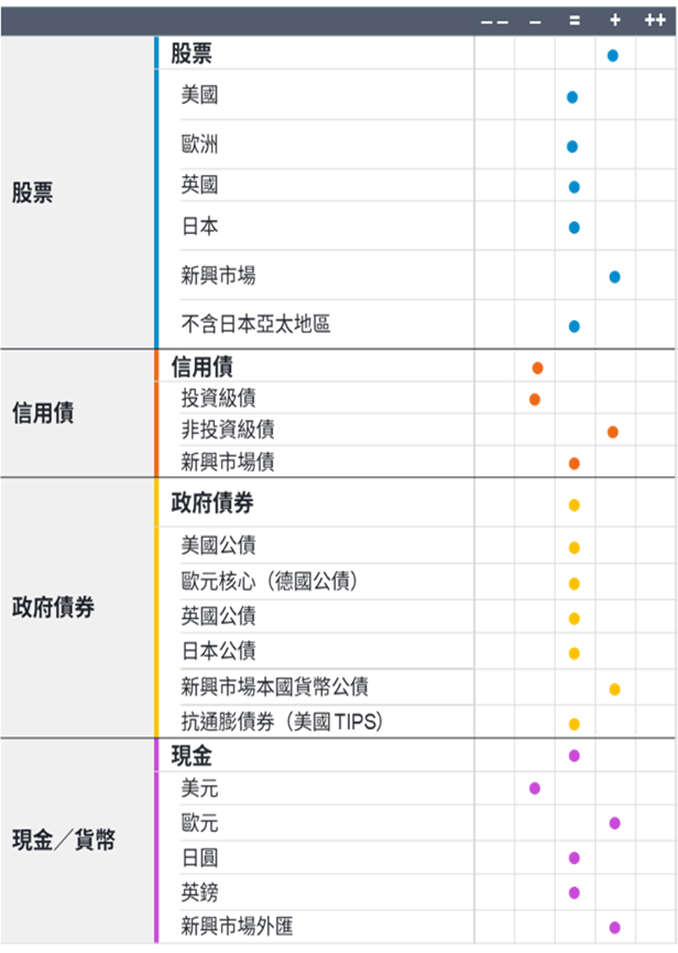 為資產配置決策提供整體出發點,但並非反映當前的投資策略立場,投資策略係根據特定目標與參數執行。區域股市觀點採用MSCI指數所定義之投資範疇。