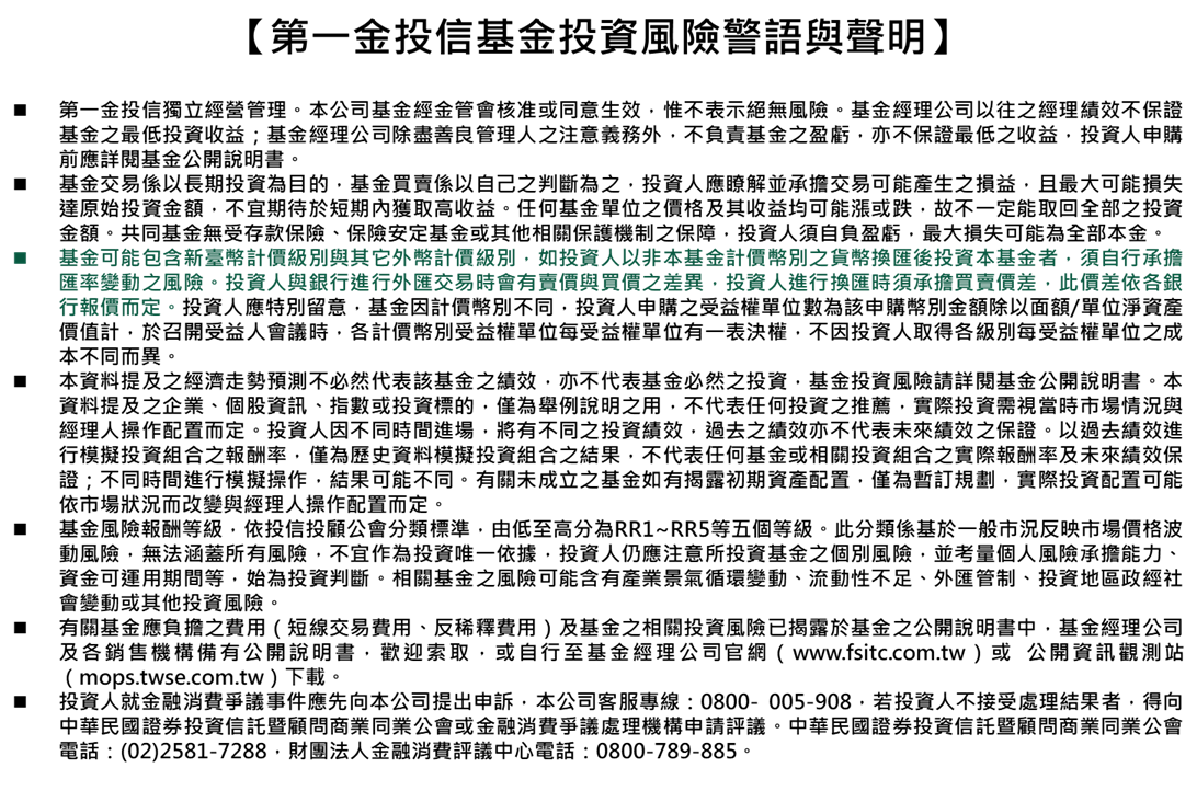 - 各基金經金融監督管理委員會(下稱「金管會」)核准或同意生效,惟不表示絕無風險。基金經理公司以往之經理績效不保證基金之最低投資收益;基金經理公司除盡善良管理人之注意義務外,不負責基金之盈虧,亦不保證最低之收益,投資人申購前應詳閱投資人須知或/與基金公開說明書。投資人申購前應自行了解判斷。