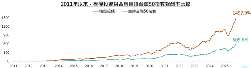 經回測2011年以來,運用「4大面向、9大因子」選股模型模擬投組的總報酬高達1497.9%,遙遙領先富時台灣50指數的表現,且經過波動風險調整後的報酬風險比也高於富時台灣50指數,驗證此選股策略能以更佳的效率獲取報酬,展現出卓越的長線成長潛力與資產配置價值。