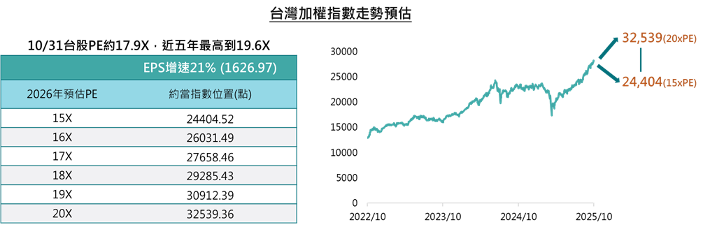 整體而言,在「基本面強勁、資金面寬鬆、AI產業趨勢明確」三大利多支撐下,台股中長線多頭行情可望持續走高。根據Bloomberg預估,2026年加權指數EPS可達1,627元,若以 15-20倍本益比區間推算,指數將落在24,404至32,539點,具備挑戰3萬點大關的潛力,因此,即使市場出現短線回檔,也應視為布局下一波多頭行情的良好時機。