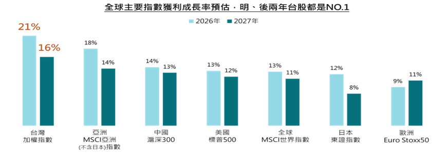 展望台股後市,我們認為台股仍具備持續上攻的關鍵動能。首先,基本面底氣十足,獲利加速成長。具備領先指標意涵的10月外銷訂單成長逾30%,確立台灣以出口為核心的經濟動能居高不墜,更值得期待的是,Bloomberg預估2026年台股獲利成長率將由今年的9.9%躍升至21.3%,增幅不僅大幅加速,且遠勝全球主要股市,凸顯台股在全球市場中的優勢。