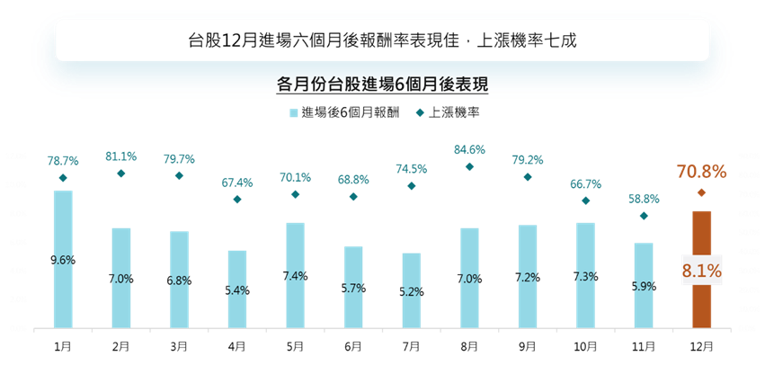 值得留意的是,台股素有季節性的規律走勢,通常第一季、第四季勝率相對較高。進一步分析各月份歷史表現,若在12月進場,台股六個月後的平均報酬率表現優異,上漲機率高達七成。此時布局,有望享受到年底作帳行情,並迎接2026年元月效應以及春節行情的紅利。