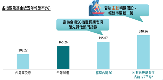 傳統ETF被動追蹤特定指數,固定時間如每季/每半年/每年才會進行調整,目標複製指數表現,相較之下,主動式ETF由專業經理人主動挑選股票,且可隨時因應市場變化靈活調整持股,目標追求超額報酬。觀察近五年報酬數據,排名在前1/2的台股基金平均報酬達240.96%,遠高於被動複製的指數,顯示若能主動精選個股,更能創造超額報酬。