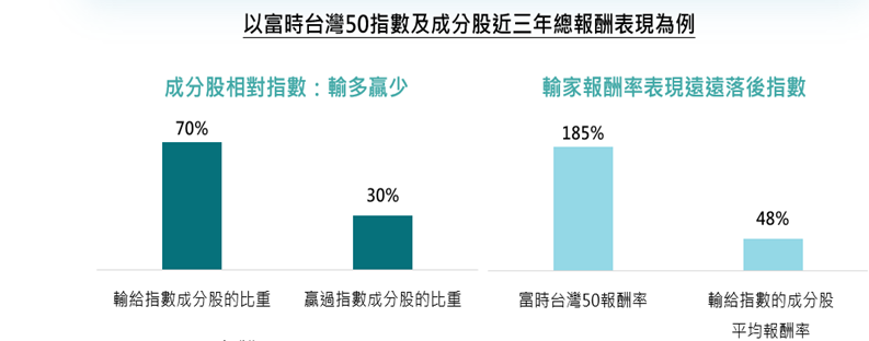 3. 成分股表現分歧:由於僅依市值篩選,指數中常出現表現落後的拖油瓶。以富時台灣50指數為例,近三年50支成分股中僅3成個股表現優於指數,7成個股則落後指數,且落後者平均報酬率僅48%,遠不如指數的185%,凸顯指數漲勢主要依賴少數個股支撐,絕大多數成分股反而都在拖後腿,導致整體指數表現無法更進一步發揮。