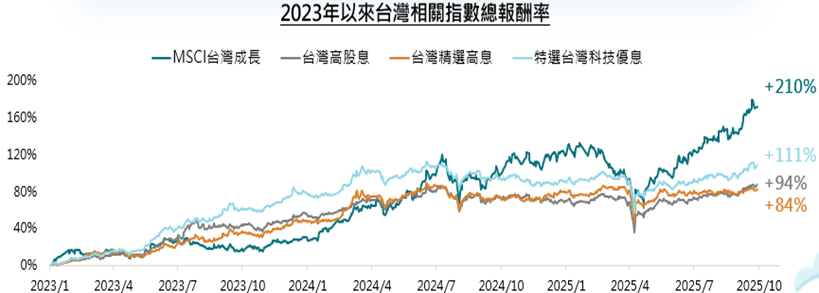 資料來源: Bloomberg、CMoney,2023/1/1-2025/10/31;MSCI台灣成長係指MSCI台灣成長指數、台灣高股息係指富時臺灣高股息指數、台灣精選高息係指臺灣精選高息指數、特選台灣科技優息係指特選臺灣科技優息指數;個股僅供舉例,未有推薦之意,亦不代表必然之投資,實際投資需視當時市場情況而定。以上僅為ETF追蹤指數績效或殖利率之表現,不代表本ETF基金之實際報酬率或配息率及未來績效保證,不同時間進場投資,其結果將可能不同,且並未考量交易成本。