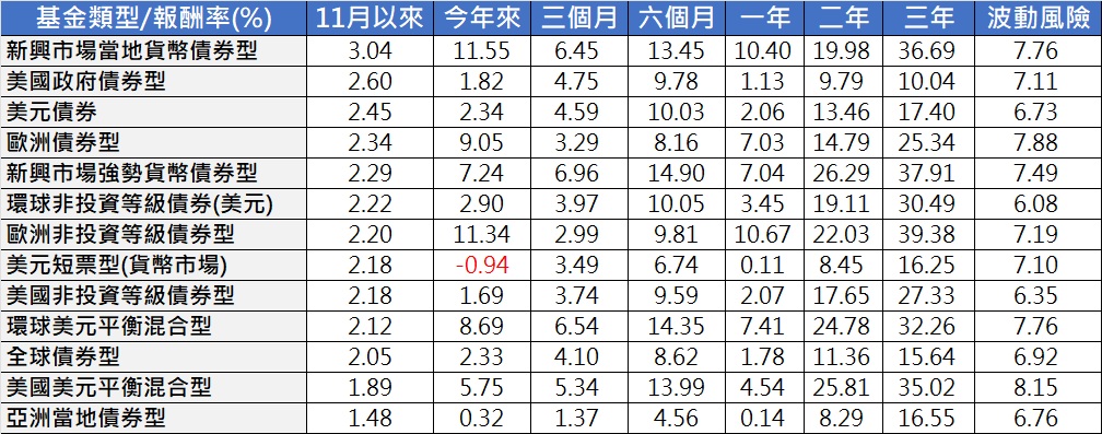11月避險需求推升各類債券表現,平衡型基金受到股市回檔所拖累而表現普遍遜於債券型基金,其中債券則以新興市場當地貨幣債券型上漲3.04%領先,美國政府債券型平均上漲2.60%居次。(附表三,理柏資訊,截至11/27)
