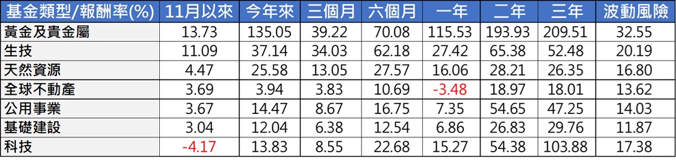 11月主要產業型基金中,科技型基金平均下跌4.17%居後。十月拉回的金市在11月上演反攻秀,黃金貴金屬股票型基金平均上漲13.73%,今年來以135%的漲幅居冠。生技股票型基金11月的平均漲幅也有11.09%,持續反應多家新藥臨床試驗有積極進展、企業併購,及政策逆風逐漸消退,愈來愈多藥廠用降價來豁免藥品關稅等利多。(附表二,理柏資訊,截至11/27)