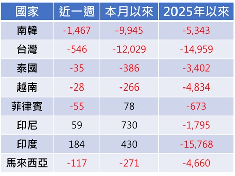 附表三:主要新興亞洲國家外資買賣超統計(單位:百萬美元)