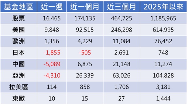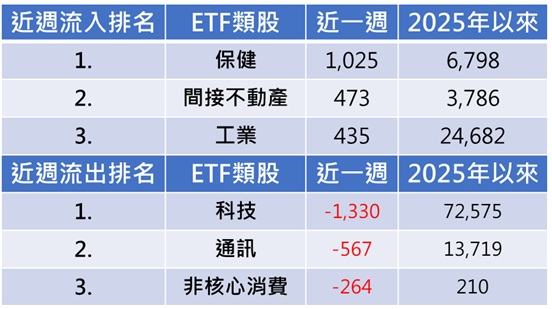 聯準會12月降息預期升高、Google發布Gemini 3模型與Nano Banana Pro等功能並獲各界好評,費城半導體單週大漲9.68%,科技股引領美股與全球股市週線收高 (彭博資訊,截至11/28) 。然而感恩節假期,資金熱度未跟上股市反彈,過去一週整體股票型ETF資金淨流入大幅降至164.65億美元,美國、歐洲各有資金淨流入98.48億、13.56億美元,日本則續遭淨賣超18.55億美元,中國和亞洲亦是賣壓沉重。依產業區分,近週淨流入前三大產業為保健、間接不動產和工業,淨流出最多的產業為科技、通訊和非核心消費。(附表一、二)