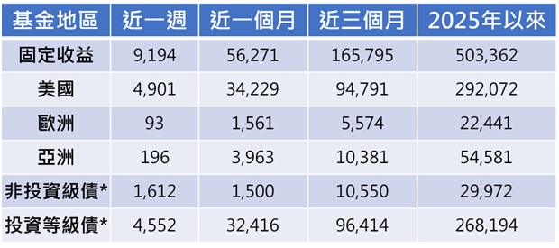 過去一週淨流入整體固定收益型ETF資金91.94億美元,其中淨流入美國債市規模49.01億美元。依債券品質分類,投資等級債市獲淨流入45.52億美元,非投資等級債市由上週流出轉向為淨流入為16.12億美元。(附表四)