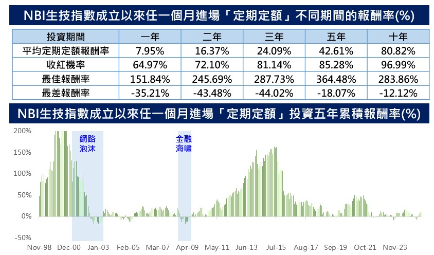 資料來源︰理柏資訊,原幣計價,以NBI生技指數CR進行計算,統計期間為1993年11月至2025年11月。定期定額報酬率係理柏資訊假設每月1日扣款,遇例假日則以次一營業日計算。投資人因不同時間進場,將有不同之投資績效,且過去績效不代表未來績效之保證。投資報酬率以投資報酬除以投資成本簡單計算,暫不考慮時間價值。投資人不能直接投資指數。<以上試算結果並非代表特定基金之投資成果,亦不代表對特定基金之買賣建議。基金不同於指數,可能會有中途清算或合併等情形。投資人無法直接投資指數>