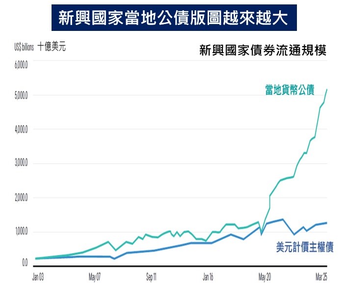 資料來源:富蘭克林坦伯頓全球宏觀投資團隊,2025年6月。取摩根大通新興國家當地公債指數以及美元主權債指數成份債之發行量。投資人申購本基金係持有基金受益憑證,而非本文提及之投資資產或標的。<本文提及之經濟走勢不必然代表本基金之績效,本基金投資風險請詳閱基金公開說明書>