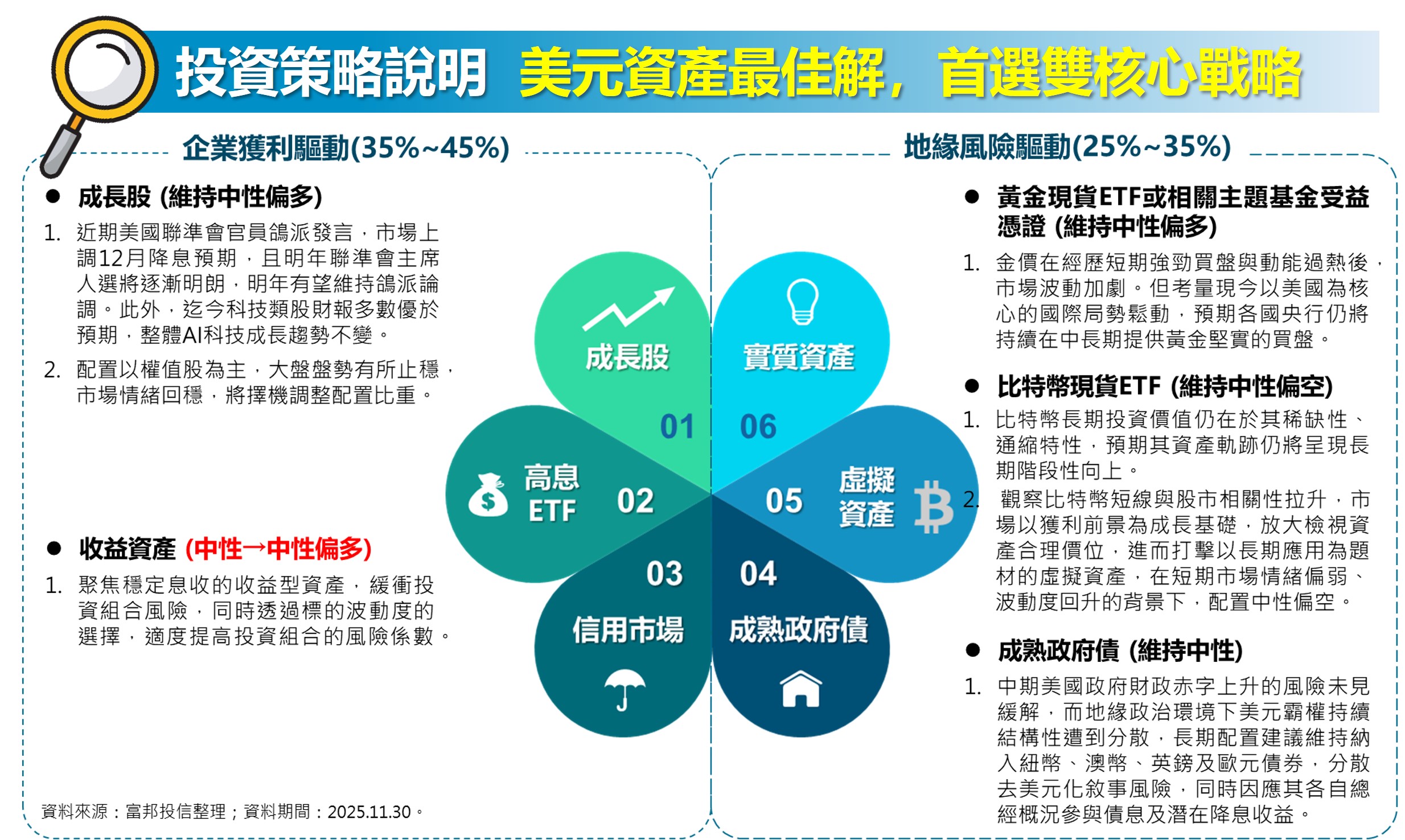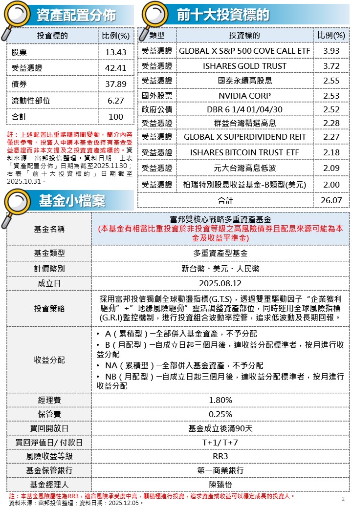 【富邦雙核心戰略多重資產基金(本基金有相當比重投資於非投資等級之高風險債券且配息來源可能為本金及收益平準金)】【富邦投信獨立經營管理】本基金經金管會或其指定機構核准或同意生效,惟不表示本基金絕無風險。基金經理公司以往之經理績效不保證本基金之最低投資收益;基金經理公司除盡善良管理人之注意義務外,不負責本基金之盈虧,亦不保證最低之收益;本文提及之經濟走勢預測不必然代表基金之績效;基金之投資風險及有關基金應負擔之費用已揭露於基金之公開說明書,投資人申購前應詳閱基金公開說明書。本公司及各銷售機構備有簡式公開說明書或公開說明書,歡迎索取;投資人亦可連結至富邦投信網頁(https://www.fubon.com/asset-management/index)或公開資訊觀測站(https://mops.twse.com.tw)查詢。有關本基金運用限制、應負擔之費用及投資風險之揭露請詳見本基金公開說明書。投資人申購本基金係持有基金受益憑證,而非本文提及之投資資產或標的。本基金適合風險承受度中高,願積極進行投資,追求資產或收益可以穩定成長的投資人,由於本基金得視市場情況投資非投資等級債券,投資人投資本基金時不宜占其投資組合過高之比重。由於非投資等級債券之信用評等未達投資等級或未經信用評等,且對利率變動的敏感度甚高,本基金可能因利率上升、市場流動性下降或債券發行機構違約不支付利息、本金或破產而蒙受虧損,故本基金不適合無法承受相關風險之投資人,又本基金可投資於美國Rule144A債券,該債券屬私募性質,故而發行人之財務狀況較不透明,較可能發生流動性不足,財務訊息揭露不完整或因價格不透明導致波動性較大之風險。本基金投資於「具總損失吸收能力(TotalLoss-AbsorbingCapacity;TLAC)債券及「應急可轉換債券(ContingentConvertibleBond,CoCoBond)」之風險:TLAC債券發行之目標是確保全球系統性重要性銀行(G-SIBs)具有必要的吸收損失和資本重組能力,多以主順位型態發行,若持有期間金融機構並非處於破產程序,該類債券之投資風險同一般債券。TLAC債券除有一般債券之共同風險,其他投資風險有:債權減記、利息取消風險、債權轉換股權風險、修改債券條件如到期日、票息、付息日或暫停配息等風險、流動性風險、金融領域集中度風險、突發事件風險等。應急可轉換債券發行主體為各國銀行,為具備特殊條款的可轉換公司債,當特殊條款被觸發時,債券將被強制性轉換成普通股或是減計債券本金,而持有人轉為銀行股東並分攤銀行虧損。因此應急可轉換債券除有一般債券之共同風險,其他投資風險有:發行機構集中度風險、觸發事件轉換風險、流動性風險、債權減記、息票取消風險、受償順位風險等。本基金可投資虛擬資產指數股票型基金,虛擬資產為具有高度投機性的數位「虛擬商品」其交易價格無漲跌幅之限制,容易暴漲暴跌,故有較高的價格波動風險,且目前可能沒有一致的標準及慣例對相關虛擬資產進行估值並確認虛擬資產估值的合理性。本基金計價幣別包含新臺幣、人民幣與美元計價幣別,如投資人以其他非本基金計價幣別之貨幣換匯時,須承擔銀行報價之買賣價差風險,且投資本基金或投資後取得之買回價金,需自行承擔匯率變動之風險,投資人尚須承擔匯款費用,外幣匯款費用可能高於新臺幣匯款費用;此外,基金可能投資於非基金計價幣別的投資標的,當不同幣別間之匯率產生較大變化時,將會影響該基金不同計價幣別之淨資產價值。由於中國大陸地區有實施外匯管制,人民幣匯率波動可能對該類別每受益權單位淨資產價值造成直接或間接影響之風險。本基金得投資轉換公司債,由於該債同時兼具債券與股票之特性,因此除面臨債券之利率風險、流動性風險與信用風險外,還可能因標的股票價格波動,而造成該轉換公司債之價格波動,其利率風險、外匯波動風險或債券發行違約風險都高於一般債券。本基金投資於基金受益憑證部份可能涉有重複收取經理費。在正常的景氣循環周期當中,原則上本基金之資產將以股票20%~40%、債券30%~50%、不動產投資信託基金受益證券0%~20%、現金及流動性資產0%~40%之比重進行多重資產配置;以投資工具來看,同時將考量交易成本、操作靈活性、流動性及投資主題,可能運用投資基金受益憑證比重約為20%~50%。經理公司將依據全球景氣循環階段之判斷,彈性調整各類資產之配置比重。當市場環境出現極端狀況,各類資產呈現不利之因素增加時,則投資於股票、債券、不動產投資信託受益證券、基金受益憑證任單一資產之比重最低仍有可能降至0%,惟投資前開任一資產種類之總金額,不高於本基金淨資產價值之70%。投資遞延手續費NA類型各計價類別受益權單位及NB類型各計價類別受益權單位者,其手續費之收取將於買回時支付,且該費用將依持有期間而有所不同,其餘費用之計收與前收手續費類型完全相同,亦不加計分銷費用,請參閱本公開說明書。本基金屬於多重資產型基金,投資區域以全球市場為主,本基金資產配置在全球之產業供應鏈相關或與經濟貿易相關之有價證券,包含AI應用、半導體、科技等產業發行之股票或其他有價證券。同時為平衡投資組合波動及因應景氣循環變化,亦將投資於商品ETF、成熟國家之政府機構發行之公債、公司債、特別股、REITs等息收資產,追求投資組合穩定成長機會。因此參