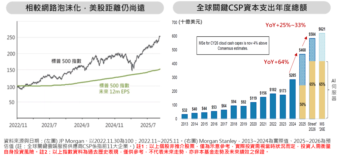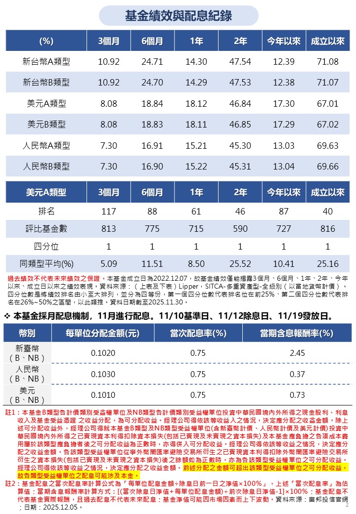 截至11/30,基金配置比重約九成,一成為流動性部位。展望2026年,台美兩大區域仍是市場青睞首選,而AI仍將是投資聚焦的關鍵所在,11/20輝達季度財報表現亮眼且優於市場預期,也是首家美股市值破5兆美元公司,市場對輝達營收及展望看法正向。因此基金未來在台美成長股配置上,將更加集中於AI應用;此外,搭配整體息收考量,將維持收益資產一定配置比重。