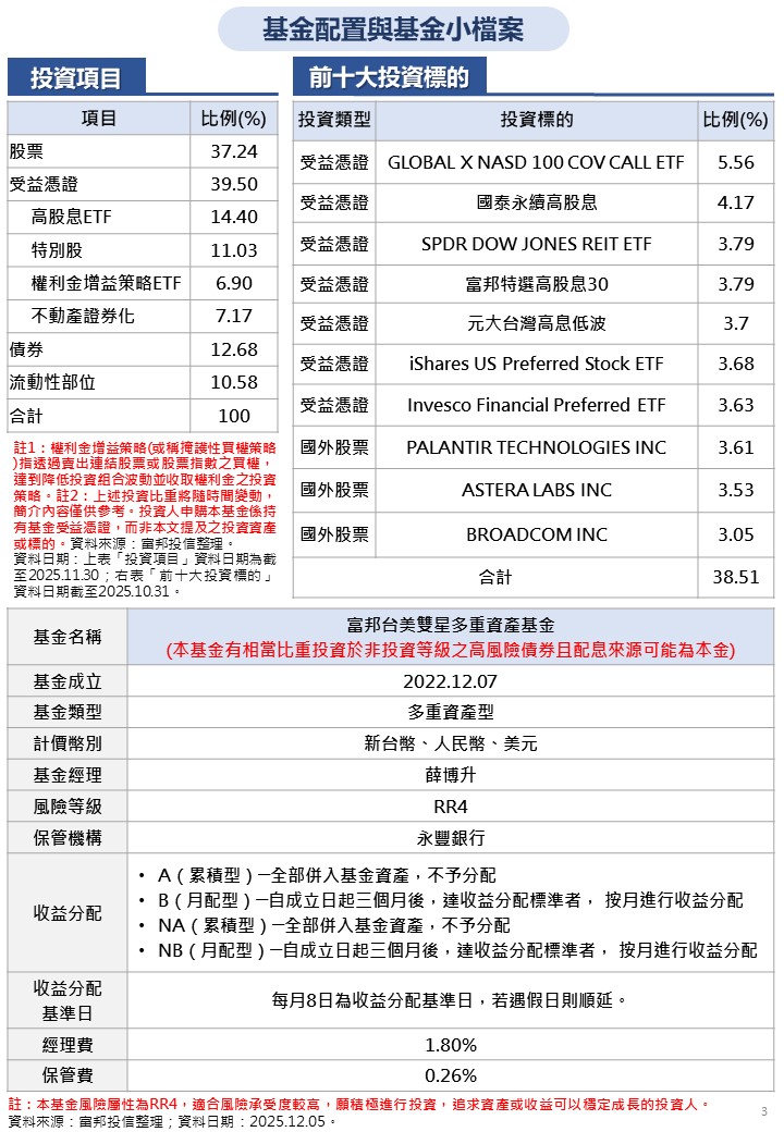 【富邦台美雙星多重資產基金(本基金有相當比重投資於非投資等級之高風險債券且配息來源可能為本金)】本基金經金管會同意生效,惟不表示本基金絕無風險。基金經理公司以往之經理績效不保證本基金之最低投資收益;基金經理公司除盡善良管理人之注意義務外,不負責本基金之盈虧,亦不保證最低之收益;本文提及之經濟走勢預測不必然代表基金之績效;基金之投資風險及有關基金應負擔之費用已揭露於基金之公開說明書,投資人申購前應詳閱基金公開說明書。本公司及各銷售機構備有簡式公開說明書或公開說明書,歡迎索取;投資人亦可連結至富邦投信網頁(https://www.fubon.com/asset-management/index)或公開資訊觀測站(https://mops.twse.com.tw)查詢。有關本基金運用限制、應負擔之費用及投資風險之揭露請詳見本基金公開說明書。