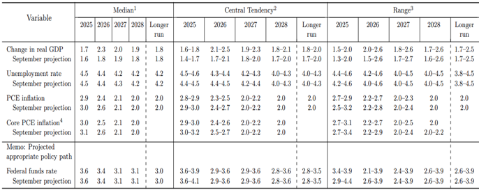 經濟展望及預期∶ 聲明措辭稱經濟一直保持溫和擴張,最新預測中調升2025-2028的經濟成長預期,2025年上調至1.7%(前次1.6%),2026上調至2.3%(前次1.8%);失業率基本不變,小幅調降2027預期至4.2%(前次4.3%),通膨方面,名目、核心通膨今明年預期均下調。