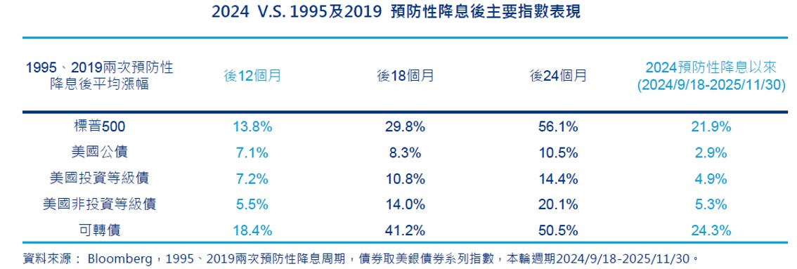 回顧前兩次預防性降息週期,在啟動後12個月,S&P500指數平均上漲13.8%,後18、24個月,平均也分別上漲29.8%和56.1%,而本輪政策仍處在預防性降息的週期當中,在經濟溫和增長和結構成長保持動能的情境下,後續仍有長線行情可期。