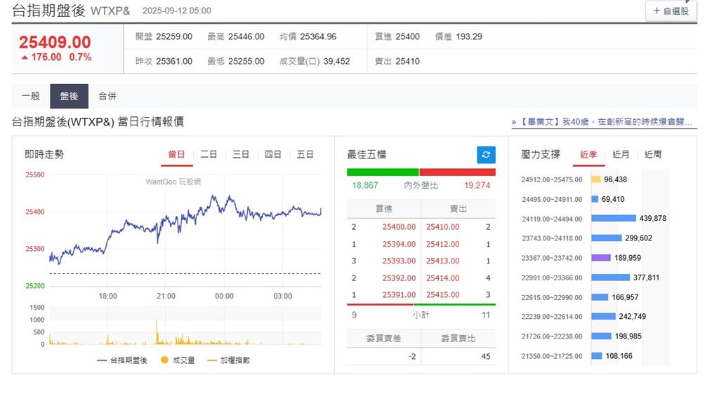 台指期盤後上漲176點、漲幅0.7%,收25,409點。