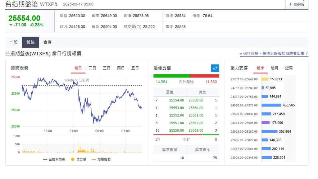 台指期盤後下跌71點、跌幅0.28%,收25554點。
